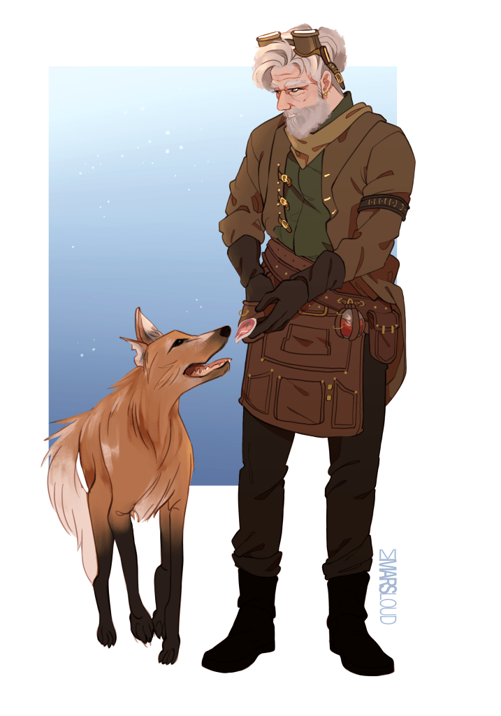 Rodrick wasn’t born north of the Kingdom of Kal-Hemma but came to the court of the Royal Council in his early twenties as a talented artificer. After having spent most of his life at the whims of the aristocracy he has decided to wander the lands in his self-made steam-powered caravan, enjoying the freedom to pursue the whims of his own curiosity and the companionship of his dog.